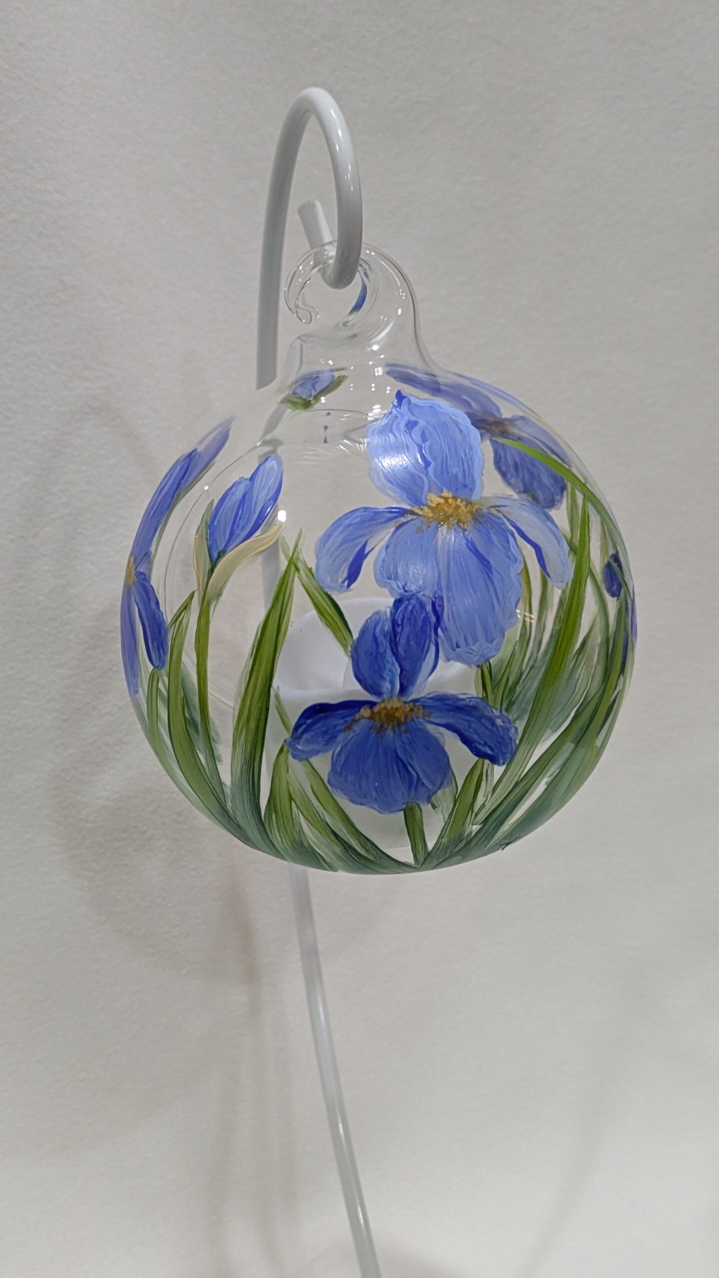 Paint blue irises around a small glass hanging globe then add a tealight. You will learn to mix colors, apply paint in layers, shade, highlight, and do detail work. Class is step by step and includes written instructions with photo, glass globe, timer tealight, and the use of all supplies. A white stand to hang the globe will be available for purchase for $2.